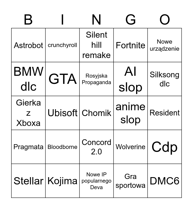 This bingo card has a free space and 24 words: Bloodborne, Kojima, Rosyjska Propaganda, Stellar, Nowe urządzenie, Astrobot, BMW dlc, crunchyroll, anime slop, Concord 2.0, AI slop, Gierka z Xboxa, Wolverine, Cdp, GTA, Gra sportowa, Resident, Silent hill remake, Silksong dlc, Ubisoft, DMC6, Pragmata, Fortnite and Nowe IP popularnego Deva.
