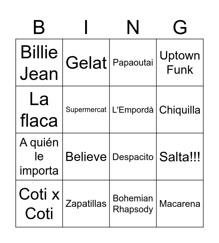 This bingo card has 53 words: Free!, Coti x Coti, MUSSEGU, Volcans, LA MARINA STA MORENA, Olívia, Gelat, Jenifer, Supermercat, Boig Per Tu, L'Empordà, Camins, Bon dia, Que tinguem sort, Devuélveme a mi chica, Bailando, Chiquilla, Zapatillas, Carolina, La flaca, Salta!!!, Escuela de Calor, A quién le importa, Billie Jean, Thriller, Beat It, Like a Prayer, Hung Up, Material Girl, Believe, Nochentera, Dancing Queen, Mamma Mia, Gimme! Gimme! Gimme!, Let's Get Loud, Tacones Rojos, Uptown Funk, Treasure, Papaoutai, Beautiful Things, Can't Get You out of My Head, Don't Stop Me Now, Bohemian Rhapsody, Help!, Hey Jude, Twist And Shout, Waka Waka, Gasolina, Despacito, Macarena, Hay Que Venir al Sur, Mi gran noche and Sarà perché ti amo.