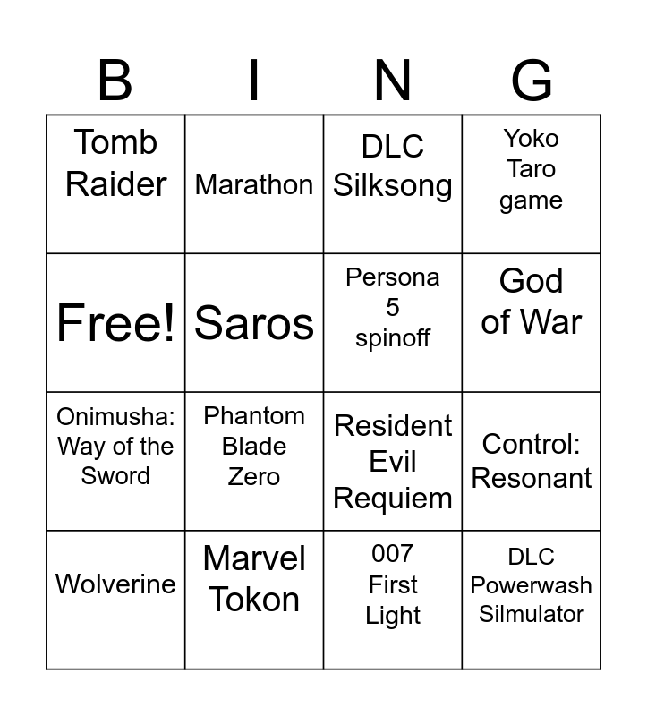 This bingo card has 16 words: Marvel Tokon, Control: Resonant, DLC Silksong, Tomb Raider, Onimusha: Way of the Sword, Marathon, Resident Evil Requiem, 007 First Light, Free!, Saros, Wolverine, Yoko Taro game, Phantom Blade Zero, God of War, Persona 5 spinoff and DLC Powerwash Silmulator.