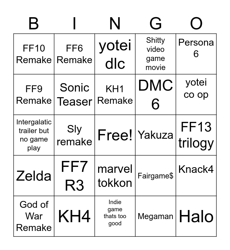 This bingo card has a free space and 24 words: FF7 R3, KH4, KH1 Remake, God of War Remake, Persona 6, FF10 Remake, FF9 Remake, FF6 Remake, Yakuza, marvel tokkon, DMC 6, Intergalatic trailer but no game play, Fairgame$, Knack4, Sonic Teaser, Megaman, FF13 trilogy, yotei dlc, yotei co op, Sly remake, Halo, Zelda, Shitty video game movie and Indie game thats too good.