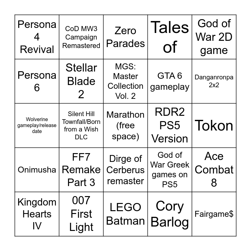 This bingo card has a free space and 24 words: FF7 Remake Part 3, 007 First Light, MGS: Master Collection Vol. 2, Kingdom Hearts IV, God of War 2D game, Persona 4 Revival, Persona 6, CoD MW3 Campaign Remastered, RDR2 PS5 Version, Dirge of Cerberus remaster, GTA 6 gameplay, Wolverine gameplay/release date, God of War Greek games on PS5, Ace Combat 8, Stellar Blade 2, Cory Barlog, Tokon, Zero Parades, Danganronpa 2x2, Silent Hill Townfall/Born from a Wish DLC, Fairgame$, Onimusha, Tales of and LEGO Batman.