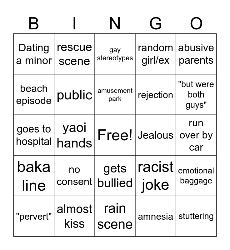 This bingo card has a free space and 24 words: no consent, almost kiss, amusement park, "pervert", abusive parents, Dating a minor, beach episode, rescue scene, Jealous, gets bullied, rejection, goes to hospital, racist joke, emotional baggage, public, amnesia, run over by car, gay stereotypes, "but were both guys", yaoi hands, stuttering, baka line, random girl/ex and rain scene.