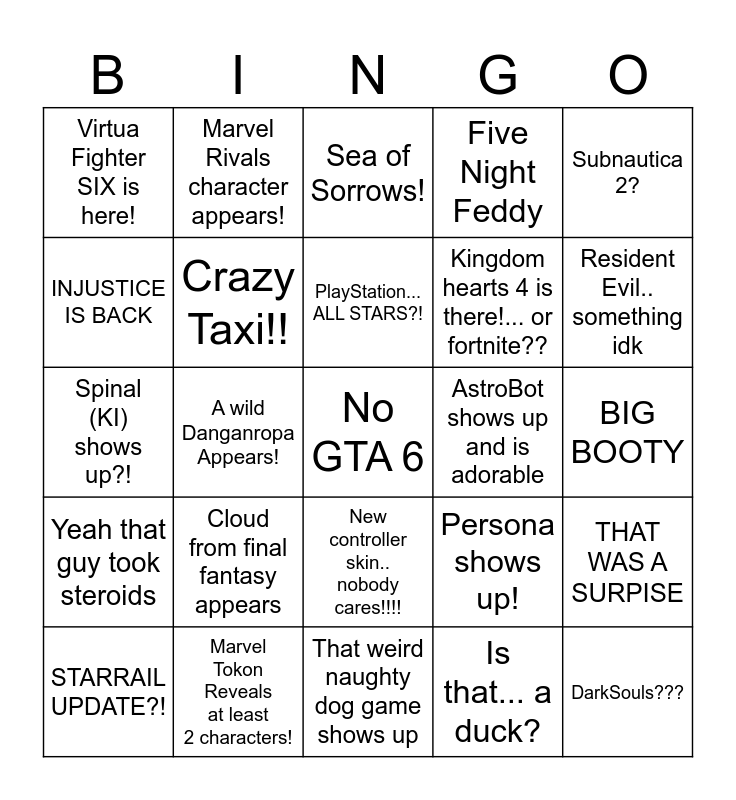 This bingo card has a free space and 24 words: Cloud from final fantasy appears, Marvel Tokon Reveals at least 2 characters!, PlayStation... ALL STARS?!, STARRAIL UPDATE?!, Subnautica 2?, Virtua Fighter SIX is here!, INJUSTICE IS BACK, Marvel Rivals character appears!, AstroBot shows up and is adorable, New controller skin.. nobody cares!!!!, Kingdom hearts 4 is there!... or fortnite??, Spinal (KI) shows up?!, Persona shows up!, THAT WAS A SURPISE, Crazy Taxi!!, Is that... a duck?, BIG BOOTY, Sea of Sorrows!, Resident Evil.. something idk, A wild Danganropa Appears!, DarkSouls???, Yeah that guy took steroids, Five Night Feddy and That weird naughty dog game shows up.