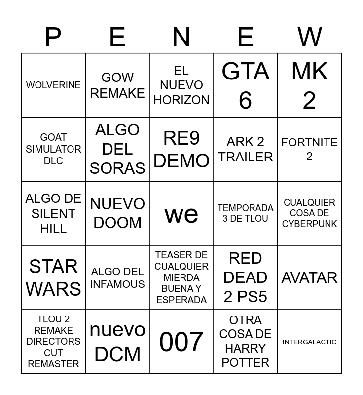 This bingo card has a free space and 24 words: ALGO DEL INFAMOUS, nuevo DCM, RE9 DEMO, TLOU 2 REMAKE DIRECTORS CUT REMASTER, MK 2, WOLVERINE, GOAT SIMULATOR DLC, GOW REMAKE, TEMPORADA 3 DE TLOU, TEASER DE CUALQUIER MIERDA BUENA Y ESPERADA, ARK 2 TRAILER, ALGO DE SILENT HILL, RED DEAD 2 PS5, AVATAR, ALGO DEL SORAS, OTRA COSA DE HARRY POTTER, CUALQUIER COSA DE CYBERPUNK, EL NUEVO HORIZON, FORTNITE 2, NUEVO DOOM, INTERGALACTIC, STAR WARS, GTA 6 and 007.