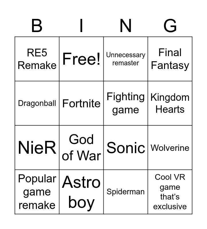 This bingo card has 19 words: Sonic, Classic game return, Unnecessary remaster, Cool VR game that’s exclusive, Wolverine, Dragonball, Spiderman, RE5 Remake, Free!, NieR, God of War, Fortnite, Fighting game, Astro boy, Popular game remake, Drakengard, Final Fantasy, Kingdom Hearts and Indie RPG with octopath traveler graphics.