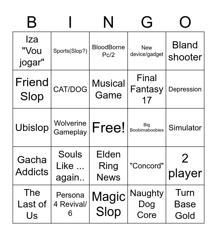 This bingo card has a free space and 24 words: Souls Like ... again.., Persona 4 Revival/ 6, Musical Game, The Last of Us, Bland shooter, Iza "Vou jogar", Friend Slop, Sports(Slop?), Big Boobimaboobies, Elden Ring News, Final Fantasy 17, Ubislop, "Concord", 2 player, CAT/DOG, Naughty Dog Core, Simulator, BloodBorne Pc/2, Depression, Wolverine Gameplay, Turn Base Gold, Gacha Addicts, New device/gadget and Magic Slop.