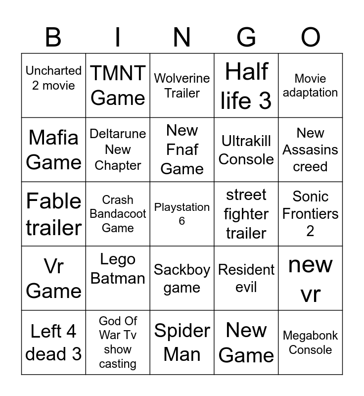 This bingo card has 30 words: God Of War Tv show casting, Elden Ring dlc/new game, Crash Bandacoot Game, Spyro Game, Uncharted 2 movie, Wolverine Trailer, Deltarune New Chapter, Sackboy game, street fighter trailer, Spider Man, Sonic Frontiers 2, Playstation 6, New Game, Megabonk Console, New Assasins creed, F1 Game, Resident evil, Vr Game, Lego Batman, Movie adaptation, Fable trailer, No mans sky update, TMNT Game, Ultrakill Console, Mafia Game, Half life 3, new vr, Left 4 dead 3, New Fnaf Game and Gta 6.