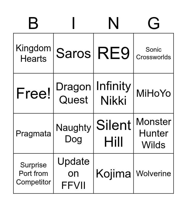 This bingo card has 16 words: Update on FFVII, Monster Hunter Wilds, RE9, Kingdom Hearts, Pragmata, Saros, Silent Hill, Kojima, Free!, Dragon Quest, Surprise Port from Competitor, Sonic Crossworlds, Naughty Dog, MiHoYo, Infinity Nikki and Wolverine.