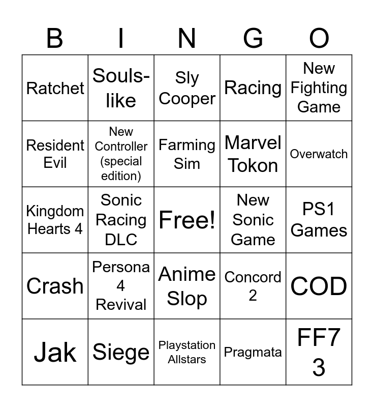 This bingo card has a free space and 24 words: Persona 4 Revival, Siege, Farming Sim, Jak, New Fighting Game, Ratchet, Resident Evil, Souls-like, New Sonic Game, Anime Slop, Marvel Tokon, Kingdom Hearts 4, Concord 2, COD, New Controller (special edition), Pragmata, PS1 Games, Sly Cooper, Overwatch, Sonic Racing DLC, FF7 3, Crash, Racing and Playstation Allstars.