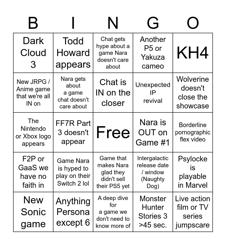 This bingo card has a free space and 24 words: Game Nara is hyped to play on their Switch 2 lol, Anything Persona except 6, Chat is IN on the closer, New Sonic game, KH4, Dark Cloud 3, New JRPG / Anime game that we're all IN on, Todd Howard appears, Nara is OUT on Game #1, Game that makes Nara glad they didn't sell their PS5 yet, Unexpected IP revival, The Nintendo or Xbox logo appears, Intergalactic release date / window (Naughty Dog), Psylocke is playable in Marvel, Nara gets about a game chat doesn't care about, Monster Hunter Stories 3 >45 sec., Borderline pornographic flex video, Chat gets hype about a game Nara doesn't care about, Wolverine doesn't close the showcase, FF7R Part 3 doesn't appear, Live action film or TV series jumpscare, F2P or GaaS we have no faith in, Another P5 or Yakuza cameo and A deep dive for a game we don't need to know more of.