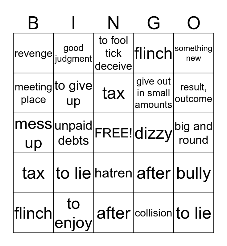 This bingo card has a free space and 24 words: to lie, to enjoy, tax, flinch, something new, revenge, meeting place, good judgment, dizzy, hatren, give out in small amounts, mess up, after, bully, to give up, collision, big and round, to fool tick deceive, result, outcome, unpaid debts, to lie, tax, flinch and after.