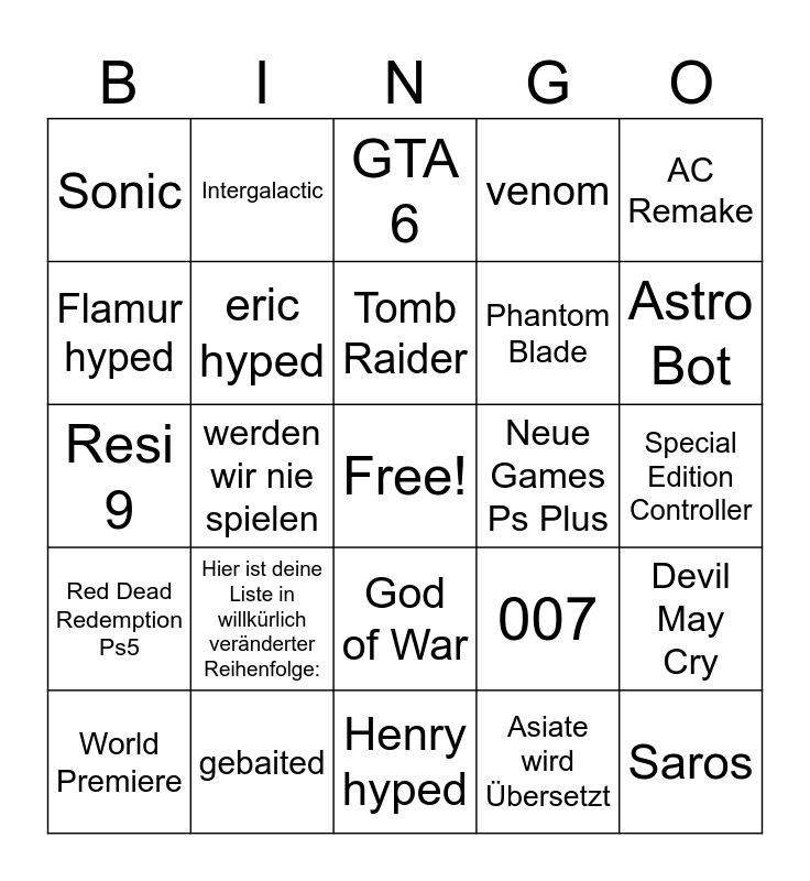 This bingo card has a free space and 25 words: Hier ist deine Liste in willkürlich veränderter Reihenfolge:, Henry hyped, Tomb Raider, World Premiere, AC Remake, Sonic, Flamur hyped, Intergalactic, Neue Games Ps Plus, God of War, Phantom Blade, Resi 9, 007, Devil May Cry, eric hyped, DLC, Special Edition Controller, GTA 6, Astro Bot, werden wir nie spielen, Saros, gebaited, Red Dead Redemption Ps5, venom and Asiate wird Übersetzt.