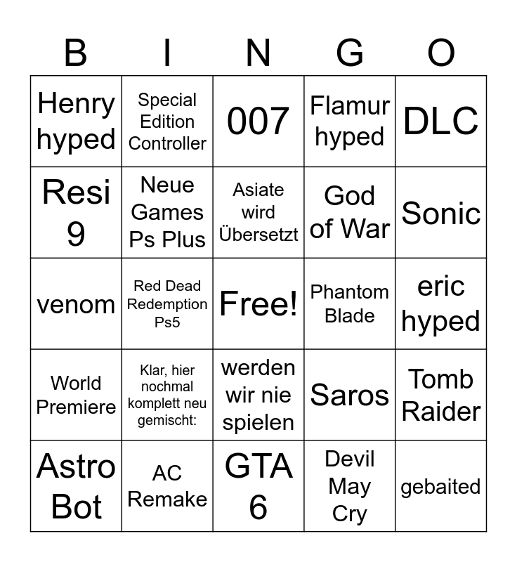 This bingo card has a free space and 25 words: Klar, hier nochmal komplett neu gemischt:, GTA 6, Asiate wird Übersetzt, Astro Bot, DLC, Henry hyped, Resi 9, Special Edition Controller, Phantom Blade, werden wir nie spielen, God of War, venom, Saros, Tomb Raider, Neue Games Ps Plus, Intergalactic, eric hyped, 007, Sonic, Red Dead Redemption Ps5, gebaited, AC Remake, World Premiere, Flamur hyped and Devil May Cry.