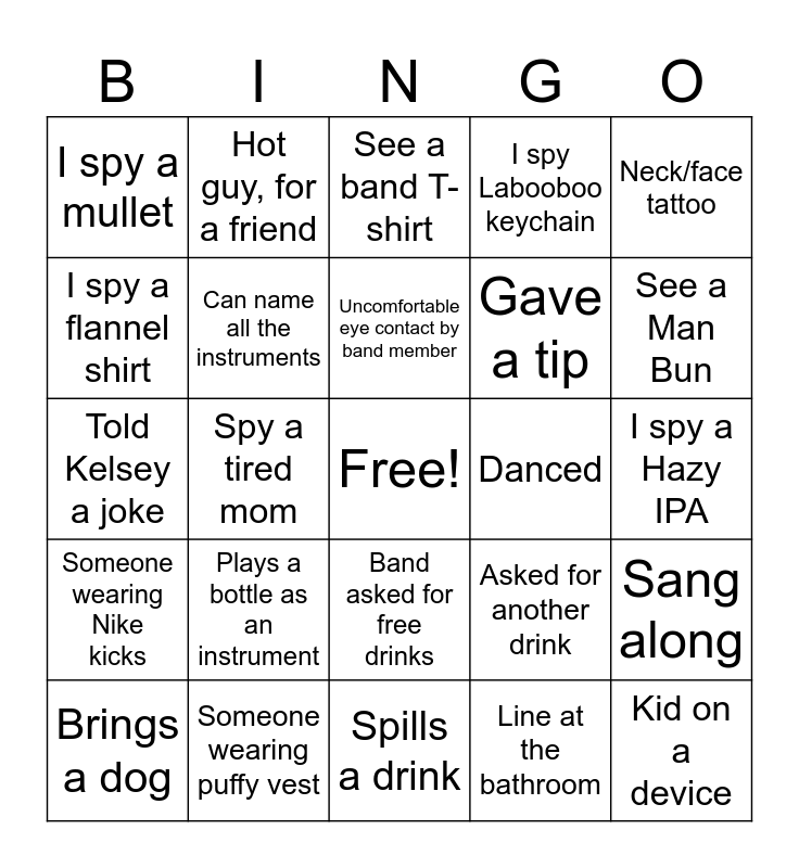 This bingo card has a free space and 25 words: Plays a bottle as an instrument, Spills a drink, Uncomfortable eye contact by band member, Brings a dog, Neck/face tattoo, I spy a mullet, I spy a flannel shirt, Hot guy, for a friend, Danced, Band asked for free drinks, Gave a tip, Told Kelsey a joke, Asked for another drink, Sang along, Can name all the instruments, I spy Birkenstocks, I spy a Hazy IPA, See a band T-shirt, See a Man Bun, Spy a tired mom, Kid on a device, Someone wearing puffy vest, Someone wearing Nike kicks, I spy Labooboo keychain and Line at the bathroom.