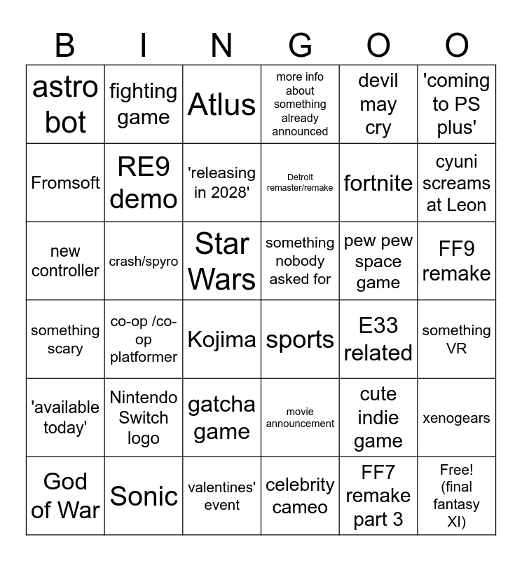This bingo card has 42 words: FF7 remake part 3, RE9 demo, Kingdom Hearts, pew pew space game, something VR, co-op /co-op platformer, new controller, 2DHD square enix game, Atlus, FF9 remake, Star Wars, Detroit remaster/remake, cyuni screams at Leon, devil may cry, Sonic, something scary, xenogears, fortnite, Free! (final fantasy XI), fighting game, 'coming to PS plus', gatcha game, 'available today', astro bot, PC port, God of War, 'releasing in 2028', Stellar Blade 2, Nintendo Switch logo, cute indie game, racing game (other than sonic), something nobody asked for, Fromsoft, E33 related, valentines' event, Kojima, sports, crash/spyro, movie announcement, celebrity cameo, more info about something already announced and ff tactics dlc.