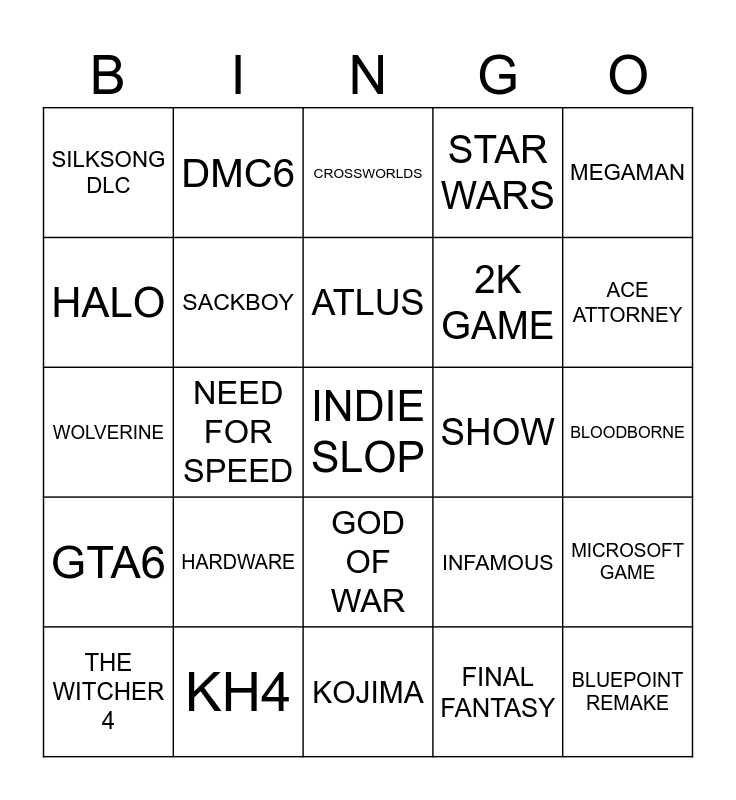 This bingo card has a free space and 34 words: SONIC, FINAL FANTASY, SPIDERMAN, STREET FIGHTER, GTA6, SACKBOY, MEGAMAN, THE WITCHER 4, DMC6, RYU GA GOTOKU, ATLUS, CROSSWORLDS, PERSONA, MARVEL TOKON, SHOW, ACE ATTORNEY, KH4, WOLVERINE, HARDWARE, INFAMOUS, GOD OF WAR, RE9, SILKSONG DLC, BLOODBORNE, KOJIMA, BLUEPOINT REMAKE, STAR WARS, SPORTS SLOP, 2K GAME, HALO, 16 BIT Game, NEED FOR SPEED, MICROSOFT GAME and FROMSOFT.