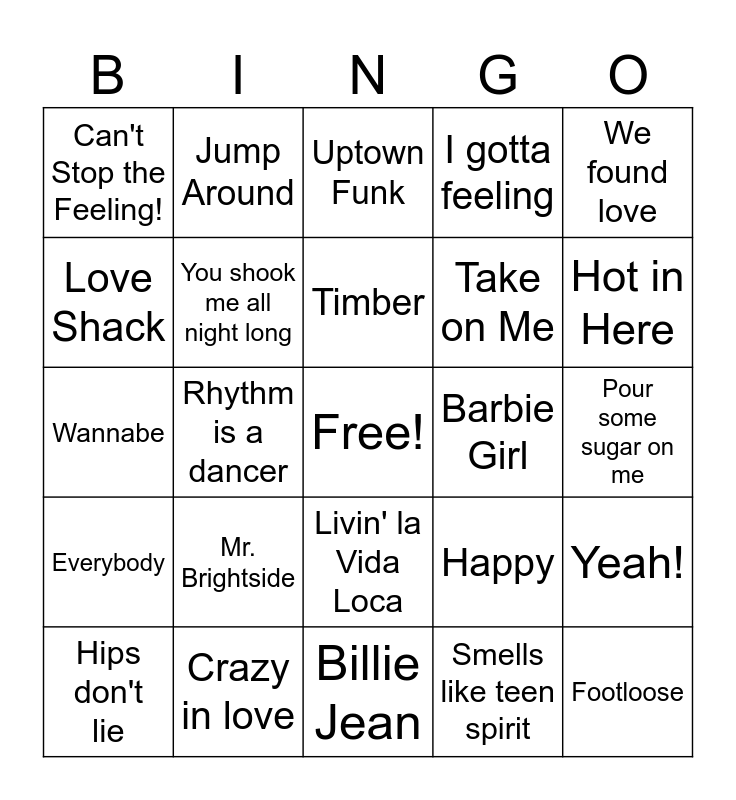 This bingo card has a free space and 34 words: Girls Just Want to Have Fun, Don't Stop Believin, Celebration, I wanna dance with somebody, Pour some sugar on me, Love Shack, You shook me all night long, Billie Jean, Take on Me, Footloose, Wannabe, Jump Around, Smells like teen spirit, No diggity, Everybody, Rhythm is a dancer, Livin' la Vida Loca, Barbie Girl, Yeah!, Hips don't lie, Crazy in love, Get the party started, I gotta feeling, Hot in Here, Toxic, Mr. Brightside, Uptown Funk, Party Rock Anthem, We found love, Can't Stop the Feeling!, Shake it Off, Timber, Happy and Turn Down for What.