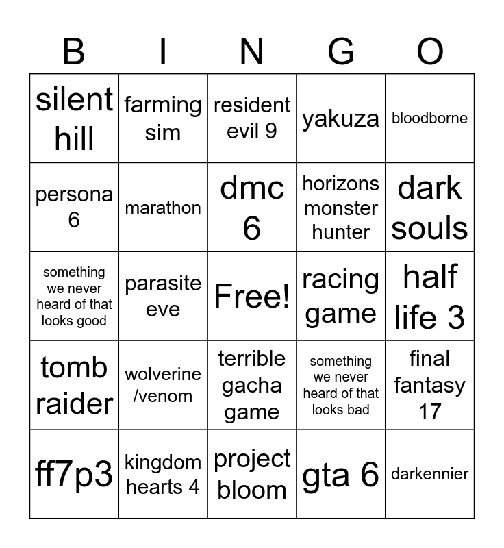 This bingo card has a free space and 24 words: wolverine /venom, kingdom hearts 4, dmc 6, ff7p3, bloodborne, silent hill, persona 6, farming sim, racing game, terrible gacha game, horizons monster hunter, something we never heard of that looks good, something we never heard of that looks bad, final fantasy 17, marathon, gta 6, half life 3, resident evil 9, dark souls, parasite eve, darkennier, tomb raider, yakuza and project bloom.