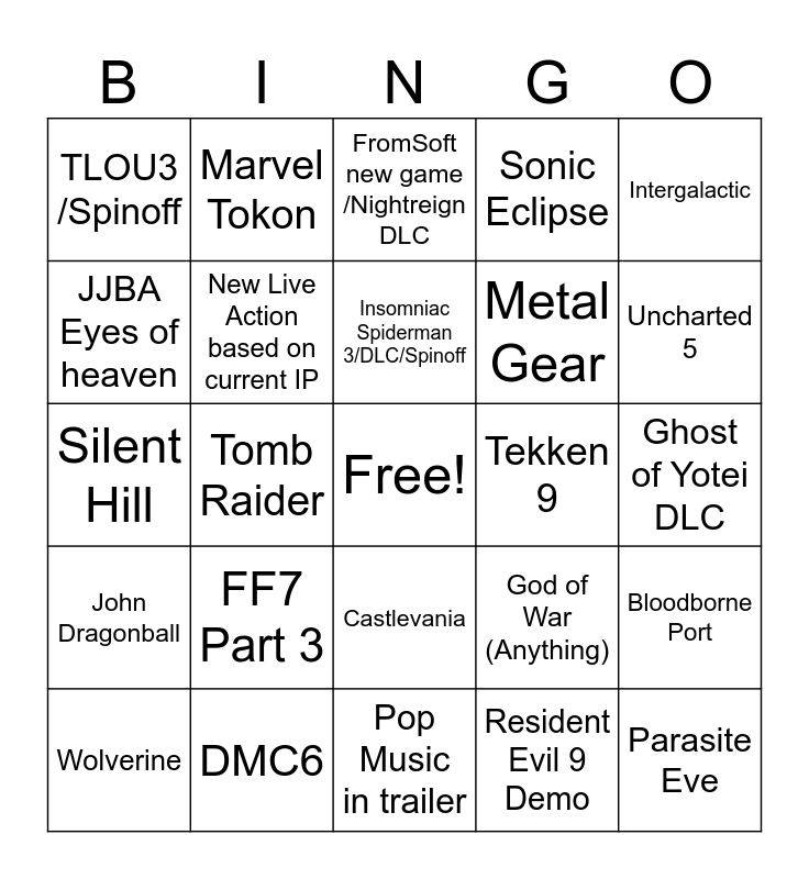 This bingo card has a free space and 24 words: FF7 Part 3, DMC6, Insomniac Spiderman 3/DLC/Spinoff, Wolverine, Intergalactic, TLOU3 /Spinoff, JJBA Eyes of heaven, Marvel Tokon, Tekken 9, Castlevania, Metal Gear, Silent Hill, God of War (Anything), Bloodborne Port, New Live Action based on current IP, Resident Evil 9 Demo, Ghost of Yotei DLC, FromSoft new game /Nightreign DLC, Uncharted 5, Tomb Raider, Parasite Eve, John Dragonball, Sonic Eclipse and Pop Music in trailer.