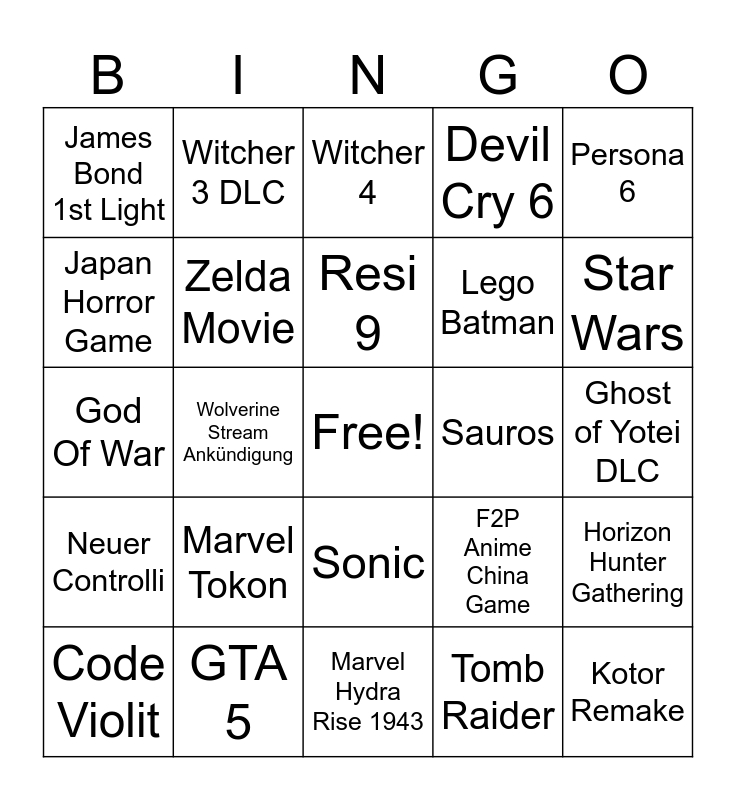 This bingo card has a free space and 24 words: Marvel Tokon, GTA 5, Resi 9, Code Violit, Persona 6, James Bond 1st Light, Japan Horror Game, Witcher 3 DLC, Sauros, Sonic, Lego Batman, God Of War, F2P Anime China Game, Horizon Hunter Gathering, Zelda Movie, Tomb Raider, Ghost of Yotei DLC, Witcher 4, Star Wars, Wolverine Stream Ankündigung, Kotor Remake, Neuer Controlli, Devil Cry 6 and Marvel Hydra Rise 1943.