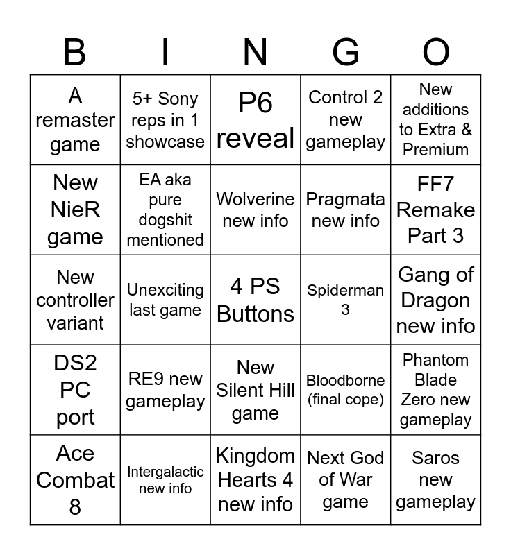 This bingo card has a free space and 24 words: RE9 new gameplay, Intergalactic new info, Wolverine new info, Ace Combat 8, New additions to Extra & Premium, A remaster game, New NieR game, 5+ Sony reps in 1 showcase, Spiderman 3, New Silent Hill game, Pragmata new info, New controller variant, Bloodborne (final cope), Phantom Blade Zero new gameplay, EA aka pure dogshit mentioned, Next God of War game, Gang of Dragon new info, P6 reveal, FF7 Remake Part 3, Unexciting last game, Saros new gameplay, DS2 PC port, Control 2 new gameplay and Kingdom Hearts 4 new info.