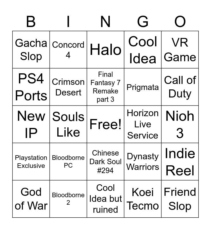 This bingo card has a free space and 24 words: Bloodborne PC, Bloodborne 2, Final Fantasy 7 Remake part 3, God of War, VR Game, Gacha Slop, PS4 Ports, Concord 4, Horizon Live Service, Chinese Dark Soul #294, Prigmata, New IP, Dynasty Warriors, Indie Reel, Crimson Desert, Koei Tecmo, Nioh 3, Halo, Call of Duty, Souls Like, Friend Slop, Playstation Exclusive, Cool Idea and Cool Idea but ruined.