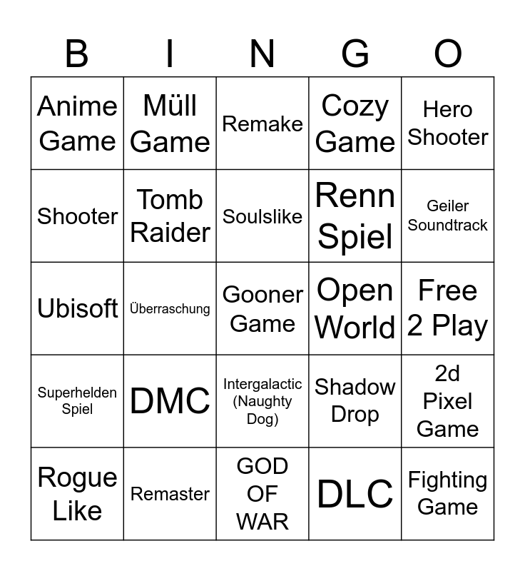 This bingo card has a free space and 24 words: DMC, Remaster, Soulslike, Rogue Like, Hero Shooter, Anime Game, Shooter, Müll Game, Open World, Intergalactic (Naughty Dog), Renn Spiel, Ubisoft, Shadow Drop, 2d Pixel Game, Tomb Raider, DLC, Free 2 Play, Remake, Geiler Soundtrack, Überraschung, Fighting Game, Superhelden Spiel, Cozy Game and GOD OF WAR.
