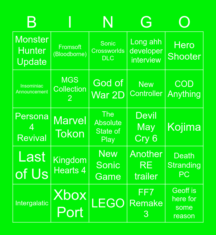This bingo card has a free space and 24 words: Kingdom Hearts 4, Xbox Port, God of War 2D, Intergalatic, Hero Shooter, Monster Hunter Update, Insominiac Announcement, Fromsoft (Bloodborne), Devil May Cry 6, New Sonic Game, New Controller, Persona 4 Revival, Another RE trailer, Death Stranding PC, MGS Collection 2, FF7 Remake 3, Kojima, Sonic Crossworlds DLC, COD Anything, Marvel Tokon, Geoff is here for some reason, Last of Us, Long ahh developer interview and LEGO.