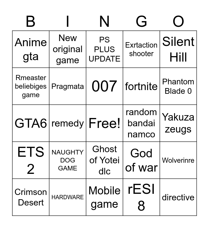 This bingo card has a free space and 24 words: NAUGHTY DOG GAME, HARDWARE, 007, Crimson Desert, Silent Hill, Anime gta, Rmeaster beliebiges game, New original game, random bandai namco, Ghost of Yotei dlc, fortnite, GTA6, God of war, Wolverinre, Pragmata, rESI 8, Yakuza zeugs, PS PLUS UPDATE, Phantom Blade 0, remedy, directive, ETS 2, Exrtaction shooter and Mobile game.