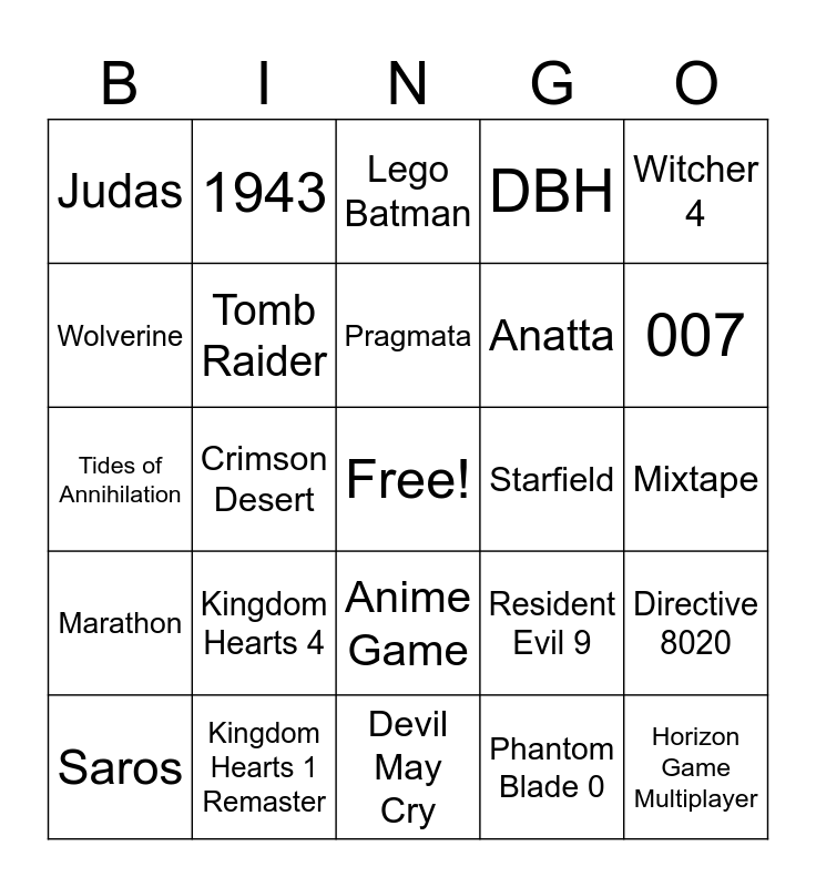 This bingo card has a free space and 24 words: Kingdom Hearts 4, Kingdom Hearts 1 Remaster, Pragmata, Saros, Witcher 4, Judas, Wolverine, 1943, Starfield, Anime Game, Anatta, Tides of Annihilation, Resident Evil 9, Directive 8020, Tomb Raider, Phantom Blade 0, Mixtape, Lego Batman, 007, Crimson Desert, Horizon Game Multiplayer, Marathon, DBH and Devil May Cry.