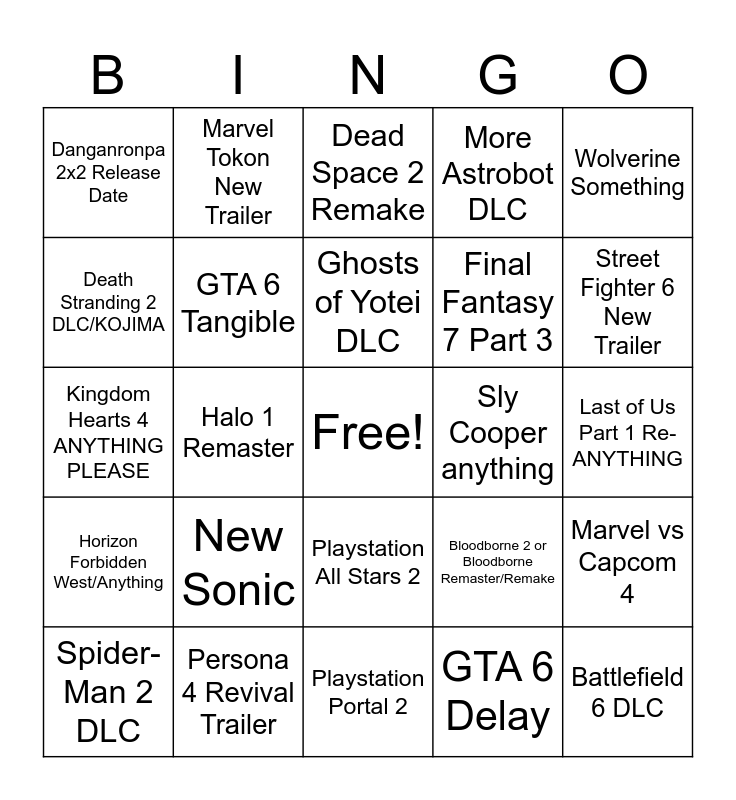 This bingo card has a free space and 24 words: New Sonic, Persona 4 Revival Trailer, Ghosts of Yotei DLC, Spider-Man 2 DLC, Wolverine Something, Danganronpa 2x2 Release Date, Death Stranding 2 DLC/KOJIMA, Marvel Tokon New Trailer, Sly Cooper anything, Playstation All Stars 2, Final Fantasy 7 Part 3, Kingdom Hearts 4 ANYTHING PLEASE, Bloodborne 2 or Bloodborne Remaster/Remake, Marvel vs Capcom 4, GTA 6 Tangible, GTA 6 Delay, Last of Us Part 1 Re-ANYTHING, Dead Space 2 Remake, Street Fighter 6 New Trailer, Halo 1 Remaster, Battlefield 6 DLC, Horizon Forbidden West/Anything, More Astrobot DLC and Playstation Portal 2.