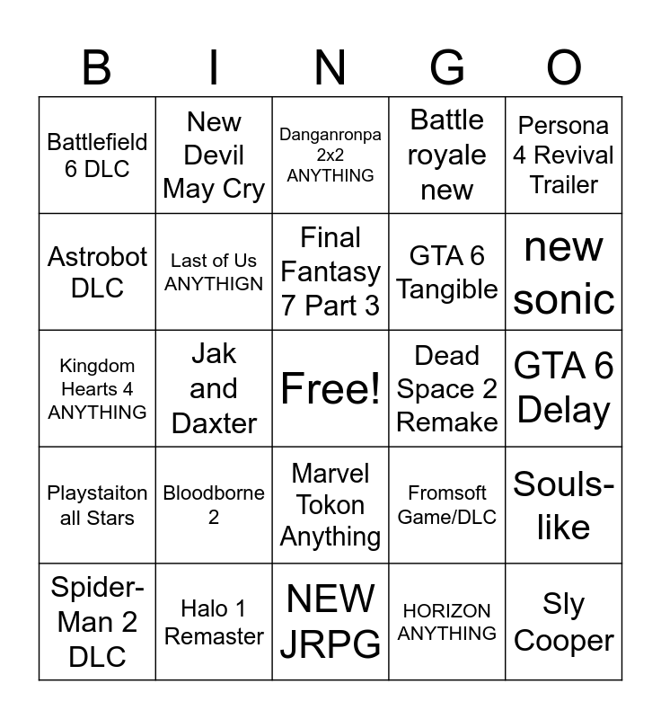 This bingo card has a free space and 24 words: Bloodborne 2, Halo 1 Remaster, Final Fantasy 7 Part 3, Spider-Man 2 DLC, Persona 4 Revival Trailer, Battlefield 6 DLC, Astrobot DLC, New Devil May Cry, Dead Space 2 Remake, Marvel Tokon Anything, GTA 6 Tangible, Kingdom Hearts 4 ANYTHING, Fromsoft Game/DLC, Souls-like, Last of Us ANYTHIGN, HORIZON ANYTHING, GTA 6 Delay, Danganronpa 2x2 ANYTHING, new sonic, Jak and Daxter, Sly Cooper, Playstaiton all Stars, Battle royale new and NEW JRPG.