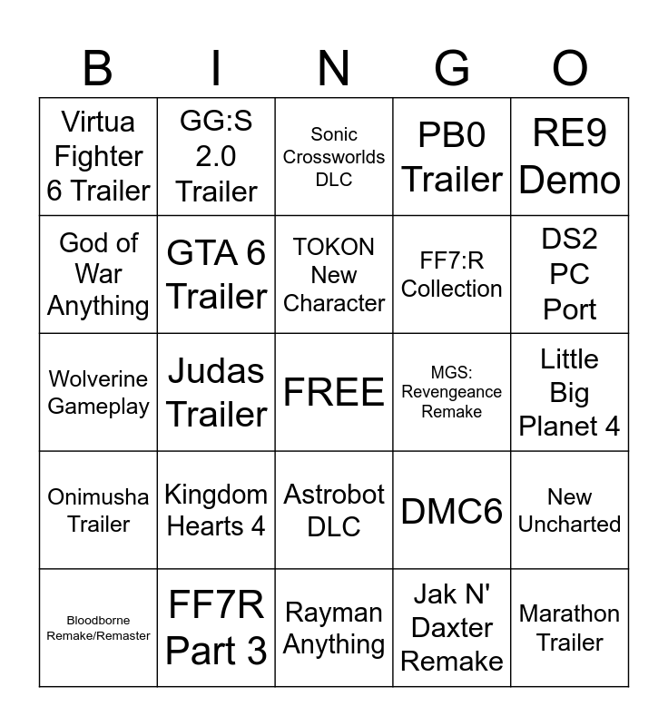 This bingo card has a free space and 24 words: Kingdom Hearts 4, FF7R Part 3, TOKON New Character, Bloodborne Remake/Remaster, RE9 Demo, Virtua Fighter 6 Trailer, God of War Anything, GG:S 2.0 Trailer, MGS: Revengeance Remake, Astrobot DLC, FF7:R Collection, Wolverine Gameplay, DMC6, New Uncharted, GTA 6 Trailer, Jak N' Daxter Remake, Little Big Planet 4, Sonic Crossworlds DLC, DS2 PC Port, Judas Trailer, Marathon Trailer, Onimusha Trailer, PB0 Trailer and Rayman Anything.