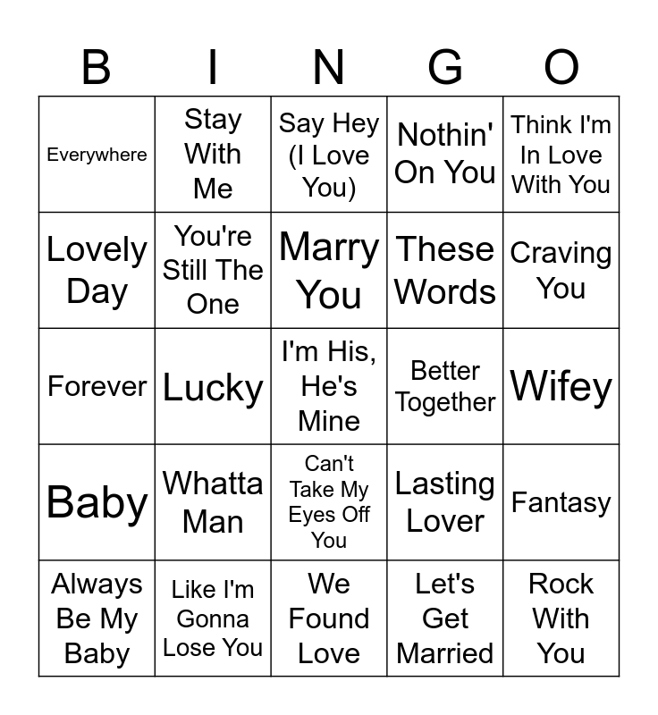 This bingo card has 35 words: Just The Way You Are, Love Story, Can't Get Enough Of Your Love, Baby, You're Still The One, Can't Take My Eyes Off You, Nothin' On You, Lovely Day, Is This Love, Marry You, Came Here For Love, Forever, Think I'm In Love With You, 10,000 Hours, Good Day For Marrying You, Everywhere, Better Together, Let's Get Married, Lucky, Baby, I'm His, He's Mine, Lasting Lover, Always Be My Baby, Fantasy, Like I'm Gonna Lose You, Say Hey (I Love You), Craving You, Rock With You, Love, These Words, Wifey, Crazy Little Thing Called Love, We Found Love, Whatta Man, Stay With Me and Marry Me.