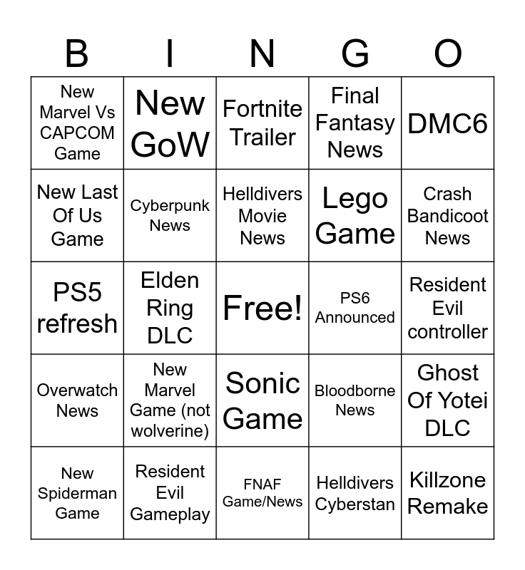 This bingo card has a free space and 24 words: New Marvel Game (not wolverine), Resident Evil Gameplay, Helldivers Movie News, New Spiderman Game, DMC6, New Marvel Vs CAPCOM Game, New Last Of Us Game, New GoW, PS6 Announced, Sonic Game, Lego Game, PS5 refresh, Bloodborne News, Ghost Of Yotei DLC, Cyberpunk News, Helldivers Cyberstan, Resident Evil controller, Fortnite Trailer, Crash Bandicoot News, Elden Ring DLC, Killzone Remake, Overwatch News, Final Fantasy News and FNAF Game/News.