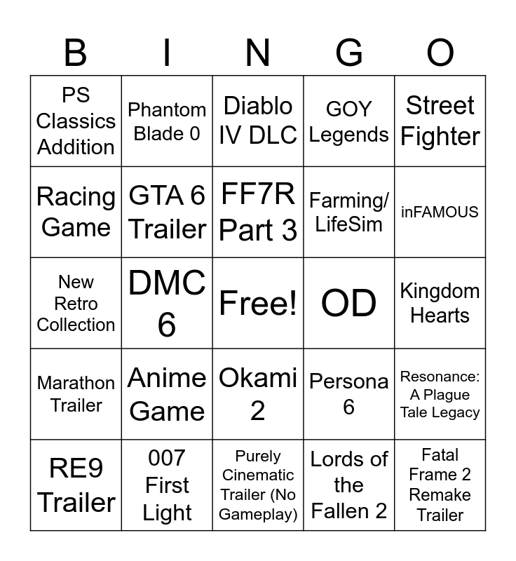 This bingo card has a free space and 39 words: Bloodborne Remaster, New PS5 Plates, New PS5 Controller, GTA 6 Trailer, RE9 Trailer, Okami 2, FF7R Part 3, Dragon Quest, Street Fighter, Marathon Trailer, DMC 6, GOY Legends, Fatal Frame 2 Remake Trailer, Kingdom Hearts, OD, Anime Game, Indie Game, PS Classics Addition, PS VR, Persona 6, Racing Game, Purely Cinematic Trailer (No Gameplay), Farming/ LifeSim, inFAMOUS, Insomniac Wolverine, New FF Remake (8 or 9), Saros, Witcher 3 DLC, Team Asobi, Phantom Blade 0, MLB The Show, LIS: Reunion, Diablo IV DLC, 007 First Light, Lords of the Fallen 2, Mouse: PI for Hire, Resonance: A Plague Tale Legacy, New Retro Collection and Fable.