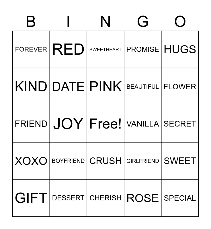This bingo card has a free space and 34 words: LOVE, ROSE, CUTE, CANDY, XOXO, DATE, HUGS, GIFT, RED, VALENTINE, PINK, SWEETHEART, WHITE, PURPLE, VANILLA, FLOWER, DESSERT, FRIEND, BOYFRIEND, GIRLFRIEND, CRUSH, CANDLES, FOREVER, SECRET, CHERISH, SPECIAL, PROMISE, PRETTY, BEAUTIFUL, KIND, CARDS, JOY, SWEET and FANCY.