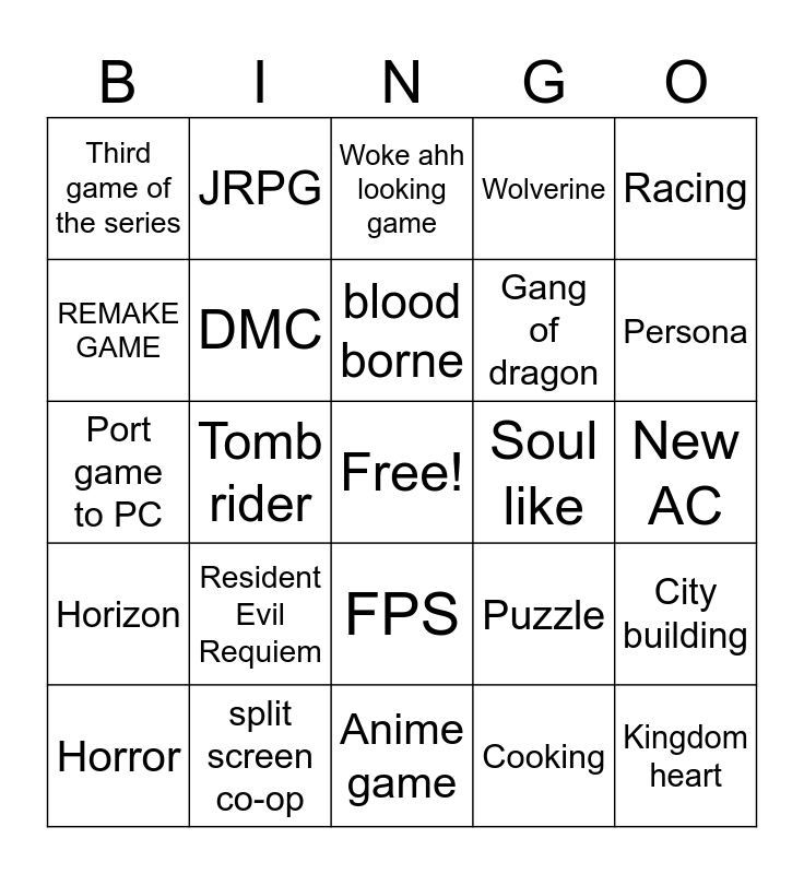 This bingo card has a free space and 24 words: Resident Evil Requiem, split screen co-op, blood borne, Horror, Racing, Third game of the series, REMAKE GAME, JRPG, Soul like, FPS, Gang of dragon, Port game to PC, Puzzle, City building, DMC, Cooking, New AC, Woke ahh looking game, Persona, Tomb rider, Kingdom heart, Horizon, Wolverine and Anime game.
