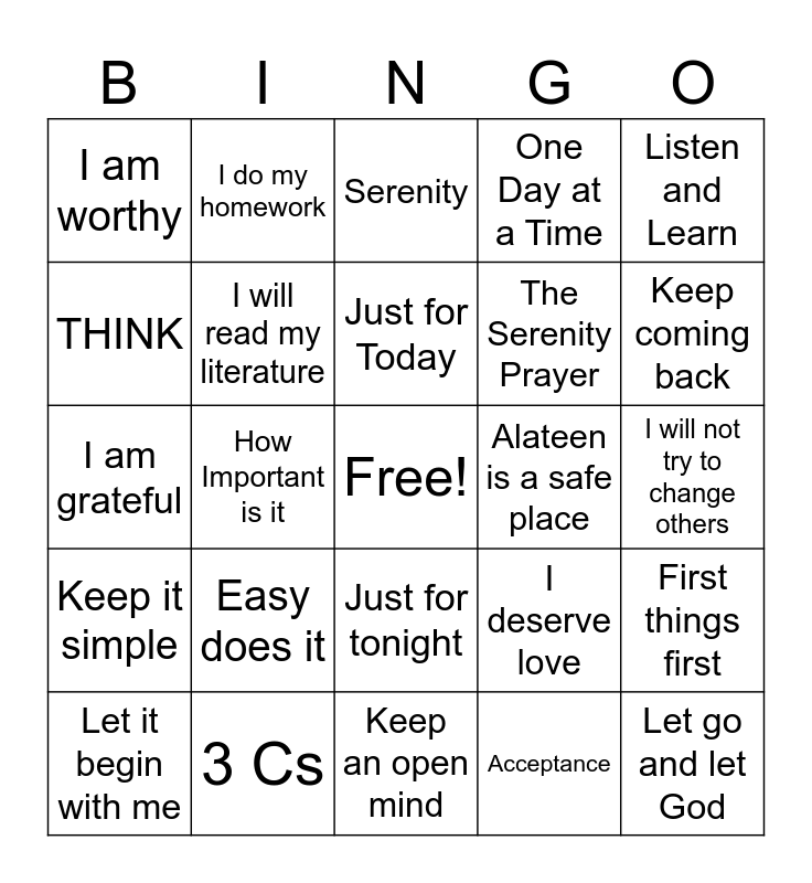 This bingo card has a free space and 24 words: Easy does it, 3 Cs, Just for Today, Let it begin with me, Listen and Learn, I am worthy, THINK, I do my homework, Alateen is a safe place, Just for tonight, The Serenity Prayer, I am grateful, I deserve love, First things first, I will read my literature, Acceptance, I will not try to change others, Serenity, Keep coming back, How Important is it, Let go and let God, Keep it simple, One Day at a Time and Keep an open mind.