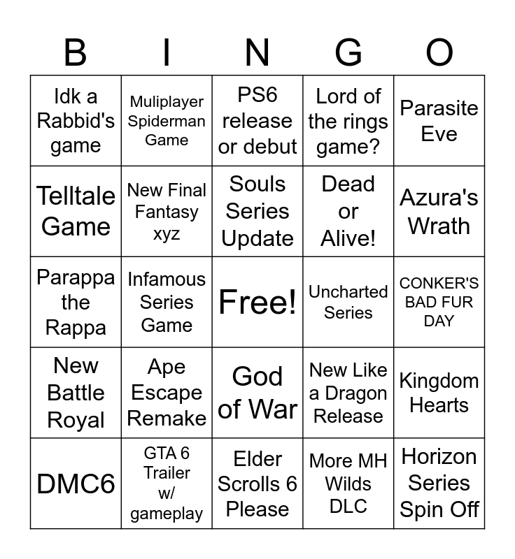 This bingo card has a free space and 24 words: Ape Escape Remake, GTA 6 Trailer w/ gameplay, Souls Series Update, DMC6, Parasite Eve, Idk a Rabbid's game, Telltale Game, Muliplayer Spiderman Game, Uncharted Series, God of War, Dead or Alive!, Parappa the Rappa, New Like a Dragon Release, Kingdom Hearts, New Final Fantasy xyz, More MH Wilds DLC, CONKER'S BAD FUR DAY, PS6 release or debut, Azura's Wrath, Infamous Series Game, Horizon Series Spin Off, New Battle Royal, Lord of the rings game? and Elder Scrolls 6 Please.