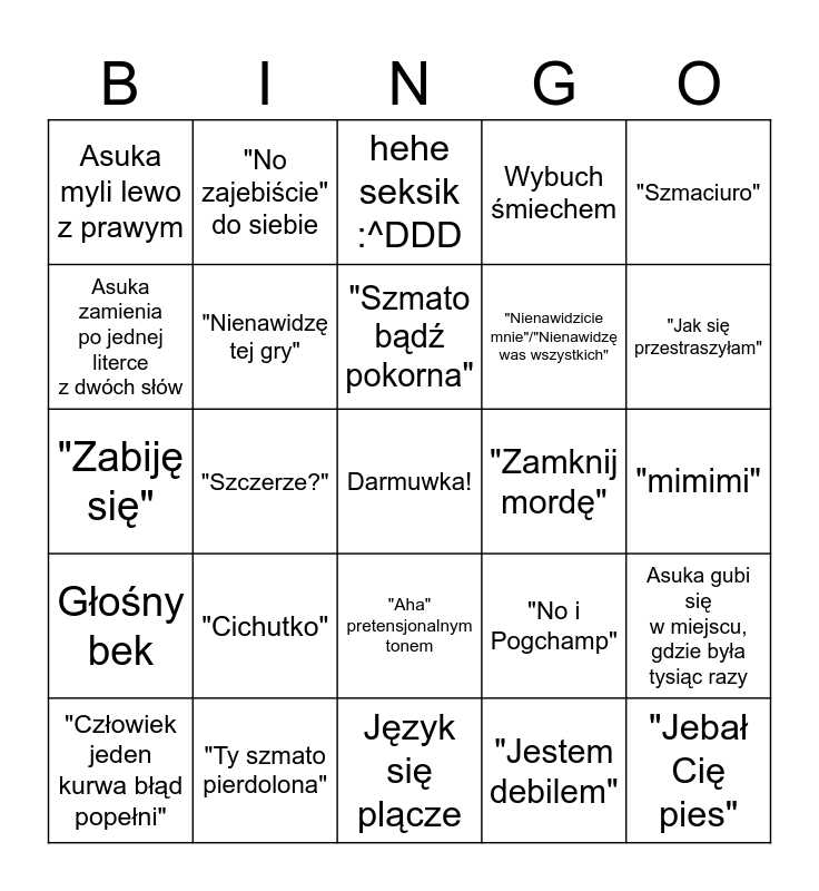 This bingo card has a free space and 24 words: "Cichutko", "Ty szmato pierdolona", "Szmato bądź pokorna", "Człowiek jeden kurwa błąd popełni", "Szmaciuro", Asuka myli lewo z prawym, Asuka zamienia po jednej literce z dwóch słów, "No zajebiście" do siebie, "Zamknij mordę", "Aha" pretensjonalnym tonem, "Nienawidzicie mnie"/"Nienawidzę was wszystkich", "Zabiję się", "No i Pogchamp", Asuka gubi się w miejscu, gdzie była tysiąc razy, "Nienawidzę tej gry", "Jestem debilem", "mimimi", hehe seksik :^DDD, "Jak się przestraszyłam", "Szczerze?", "Jebał Cię pies", Głośny bek, Wybuch śmiechem and Język się plącze.