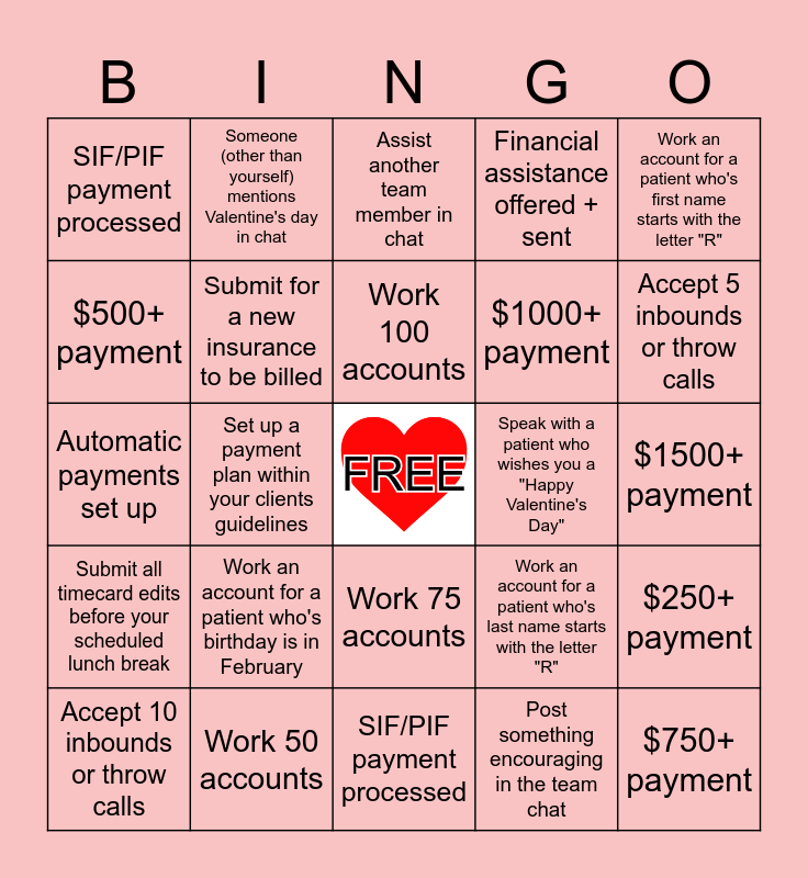 This bingo card has a free space and 24 words: Work an account for a patient who's birthday is in February, Work 50 accounts, Work 100 accounts, Accept 10 inbounds or throw calls, Work an account for a patient who's first name starts with the letter "R", SIF/PIF payment processed, $500+ payment, Someone (other than yourself) mentions Valentine's day in chat, Speak with a patient who wishes you a "Happy Valentine's Day", Work 75 accounts, $1000+ payment, Automatic payments set up, Work an account for a patient who's last name starts with the letter "R", $250+ payment, Submit for a new insurance to be billed, Post something encouraging in the team chat, $1500+ payment, Assist another team member in chat, Accept 5 inbounds or throw calls, Set up a payment plan within your clients guidelines, $750+ payment, Submit all timecard edits before your scheduled lunch break, Financial assistance offered + sent and SIF/PIF payment processed.