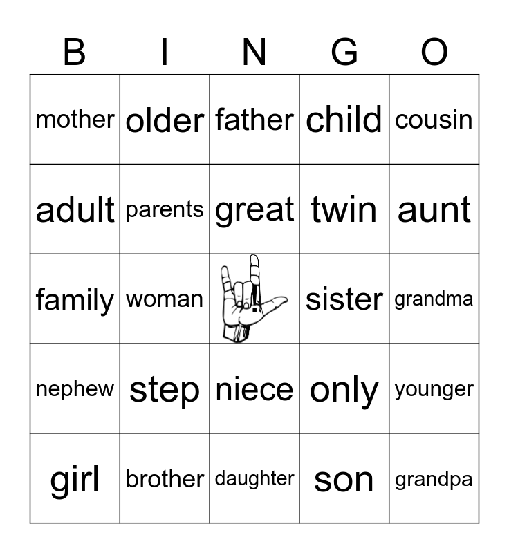 This bingo card has a free space and 29 words: girl, boy, woman, man, mother, father, parents, step, sister, brother, grandma, grandpa, daughter, son, aunt, uncle, niece, nephew, cousin, family, only, baby, twin, adult, child, older, younger, great and grand.
