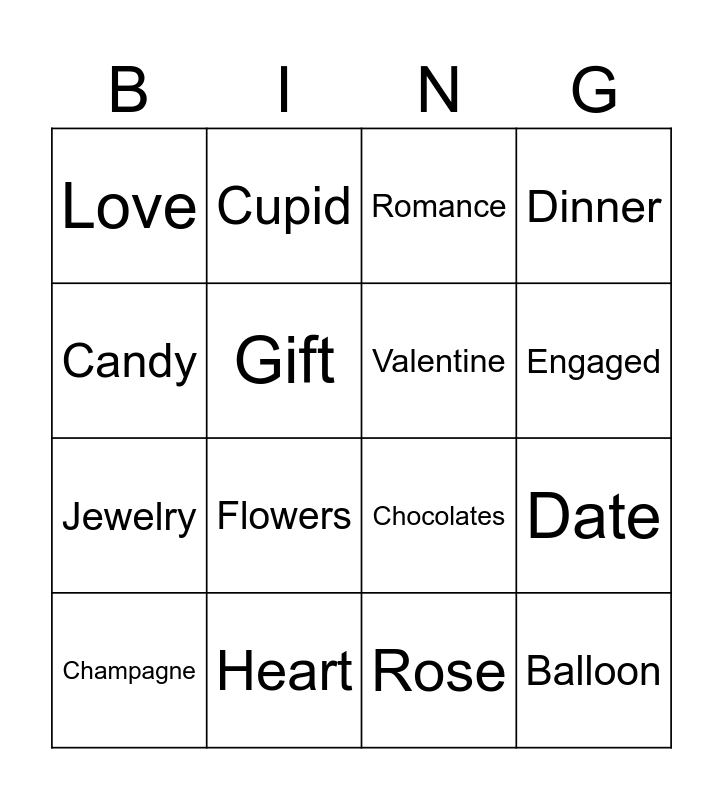 This bingo card has 16 words: Heart, Date, Romance, Love, Jewelry, Cupid, Chocolates, Rose, Candy, Gift, Champagne, Dinner, Flowers, Engaged, Valentine and Balloon.