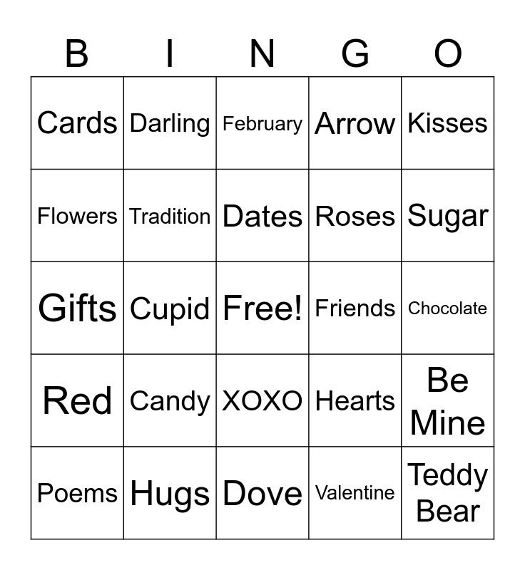 This bingo card has a free space and 24 words: Candy, Hugs, Dates, Poems, Kisses, Cards, Flowers, Darling, Friends, XOXO, Roses, Gifts, Hearts, Be Mine, Tradition, Valentine, Chocolate, February, Sugar, Cupid, Teddy Bear, Red, Arrow and Dove.