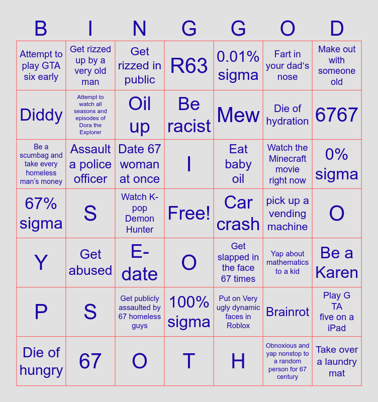 This bingo card has a free space and 62 words: 9/11, 67% sigma, Have your accent slip out in public, Assault a police officer, Take over a laundry mat, Play GTA five on a iPad, Make out with someone old, PRESIDENT, GET DOWN, Attempt to watch all seasons and episodes of Dora the Explorer, Die of hungry, R63, 100% sigma, Fart in your dad‘s nose, Car crash, Old guy, Attempt to play GTA six early, Die of hydration, 0.01% sigma, 0.1% sigma, Diddy, 6767, Get rizzed in public, 0% sigma, Watch K-pop Demon Hunter, Terrorist, Get slapped in the face 67 times, Get abused, Osama bin Laden, Watch the Minecraft movie right now, Be a Karen, Never go to your divorced racist minimum wage crippled debit mother-in-law, Get publicly assaulted by 67 homeless guys, Obnoxious and yap nonstop to a random person for 67 century, Make out in public at Times Square at the busiest moment, Be a scumbag and take every homeless man’s money, Get rizzed up by a very old man, Put on Very ugly dynamic faces in Roblox, Yap about mathematics to a kid, Mew, pick up a vending machine, Be racist, Brainrot, Date 67 woman at once, What’s 9+10? 21, Oil up, Eat baby oil, E-date, 67, T, H, I, S, I, S, P, O, O, P, O, O, Y and E.