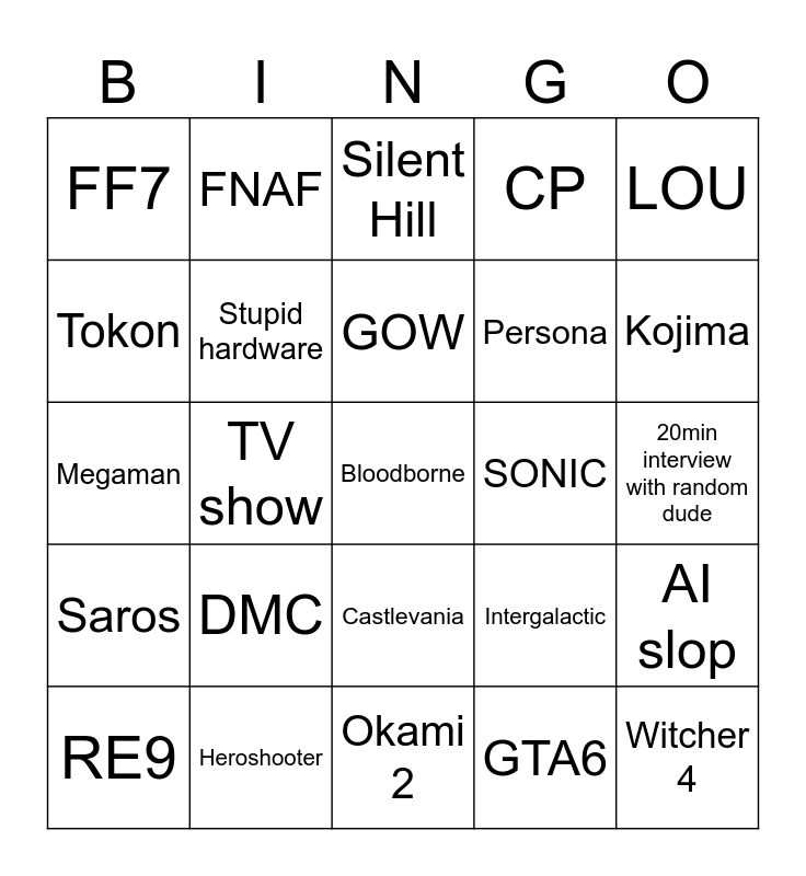 This bingo card has a free space and 24 words: DMC, Heroshooter, GOW, RE9, LOU, FF7, Tokon, FNAF, SONIC, Castlevania, Persona, Megaman, Intergalactic, AI slop, Stupid hardware, GTA6, 20min interview with random dude, Silent Hill, Kojima, TV show, Witcher 4, Saros, CP and Okami 2.