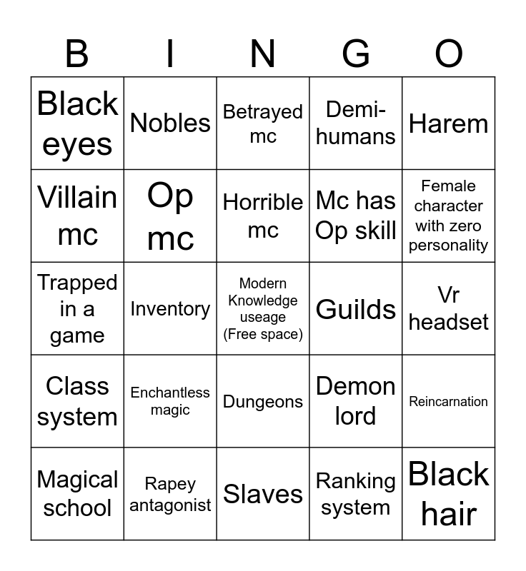 This bingo card has a free space and 24 words: Magical school, Enchantless magic, Horrible mc, Ranking system, Harem, Black eyes, Nobles, Betrayed mc, Guilds, Vr headset, Trapped in a game, Op mc, Demon lord, Reincarnation, Villain mc, Rapey antagonist, Slaves, Demi-humans, Female character with zero personality, Class system, Inventory, Dungeons, Mc has Op skill and Black hair.