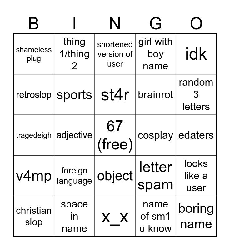 This bingo card has a free space and 24 words: foreign language, space in name, st4r, christian slop, idk, shameless plug, retroslop, thing 1/thing 2, cosplay, object, brainrot, tragedeigh, letter spam, looks like a user, sports, name of sm1 u know, edaters, shortened version of user, random 3 letters, adjective, boring name, v4mp, girl with boy name and x_x.