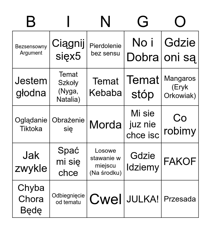 This bingo card has a free space and 24 words: Spać mi się chce, Odbiegnięcie od tematu, Temat Kebaba, Chyba Chora Będę, Gdzie oni są, Bezsensowny Argument, Jestem głodna, Ciągnij sięx5, Mi sie juz nie chce isc, Losowe stawanie w miejscu (Na środku), Temat stóp, Oglądanie Tiktoka, Gdzie Idziemy, FAKOF, Temat Szkoły (Nyga, Natalia), JULKA!, Co robimy, Pierdolenie bez sensu, Mangaros (Eryk Orkowiak), Obrażenie się, Przesada, Jak zwykle, No i Dobra and Cwel.